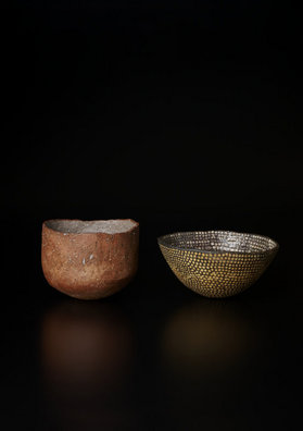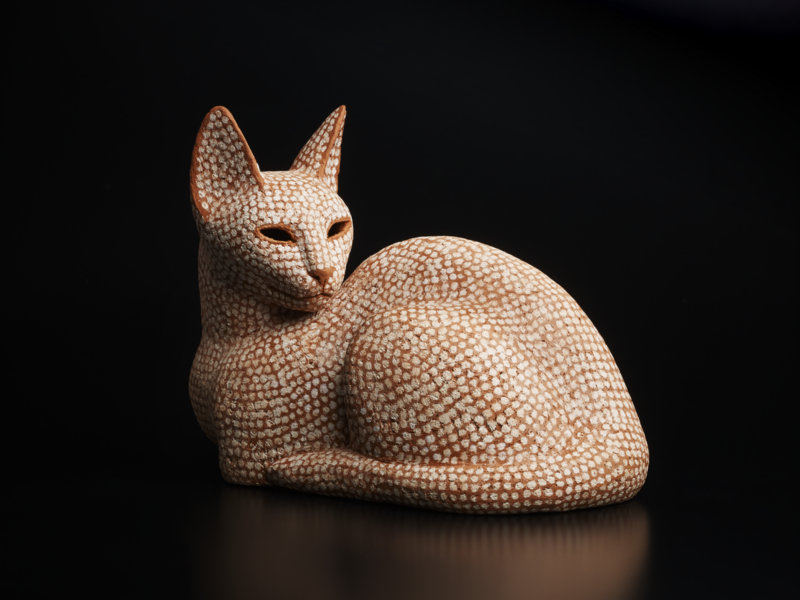 今回、猫の作品のいくつかに点刻の代わりに土の表面を磨いて焼く、という新たな試みが見られる。これは古代の技法の一つである。作品全体を執拗に磨くという行為は、祈りのこころで白土を一つ一つ埋めている今までの作法と通じるのかもしれない。